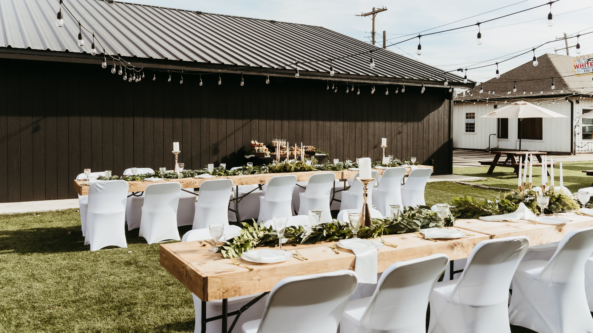 From elegant long-table dinners (as pictured) to comfortable cocktail receptions with high-top seating, our venue transforms seamlessly to match your vision and guest count.